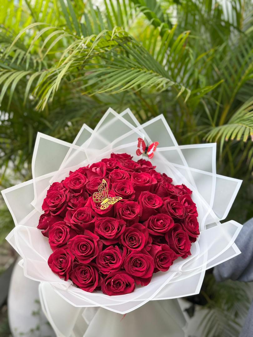 Love in full bloom, with a touch of whimsy. Our Enchanted Bouquet features dozens of hand-selected, premium red roses arranged in a modern, star-shaped architectural wrap. Adorned with delicate gold and red butterfly accents, this bouquet symbolizes transformation and timeless beauty.