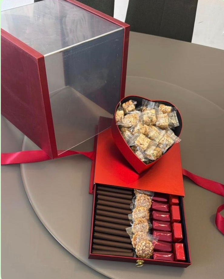 Artisanal Variety: Features a curated selection of rich chocolate squares, crunchy hazelnut pralines, pistachio-dusted treats, and creamy truffles.