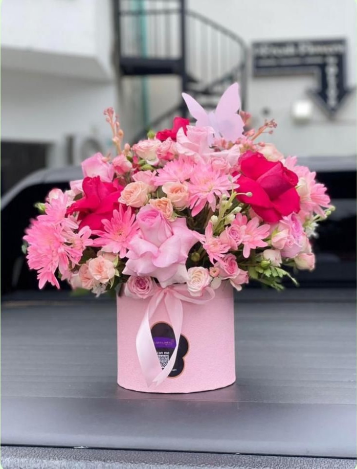 Sophistication in a box. Celebrate in style with our Pink Perfection Bloom Box. This lush arrangement features a vibrant mix of premium hot pink and soft blush roses, accented with delicate fillers and a signature butterfly ornament. Housed in a premium pink velvet hat box and finished with a matching satin ribbon, this arrangement is the definition of “ready-to-display” luxury.