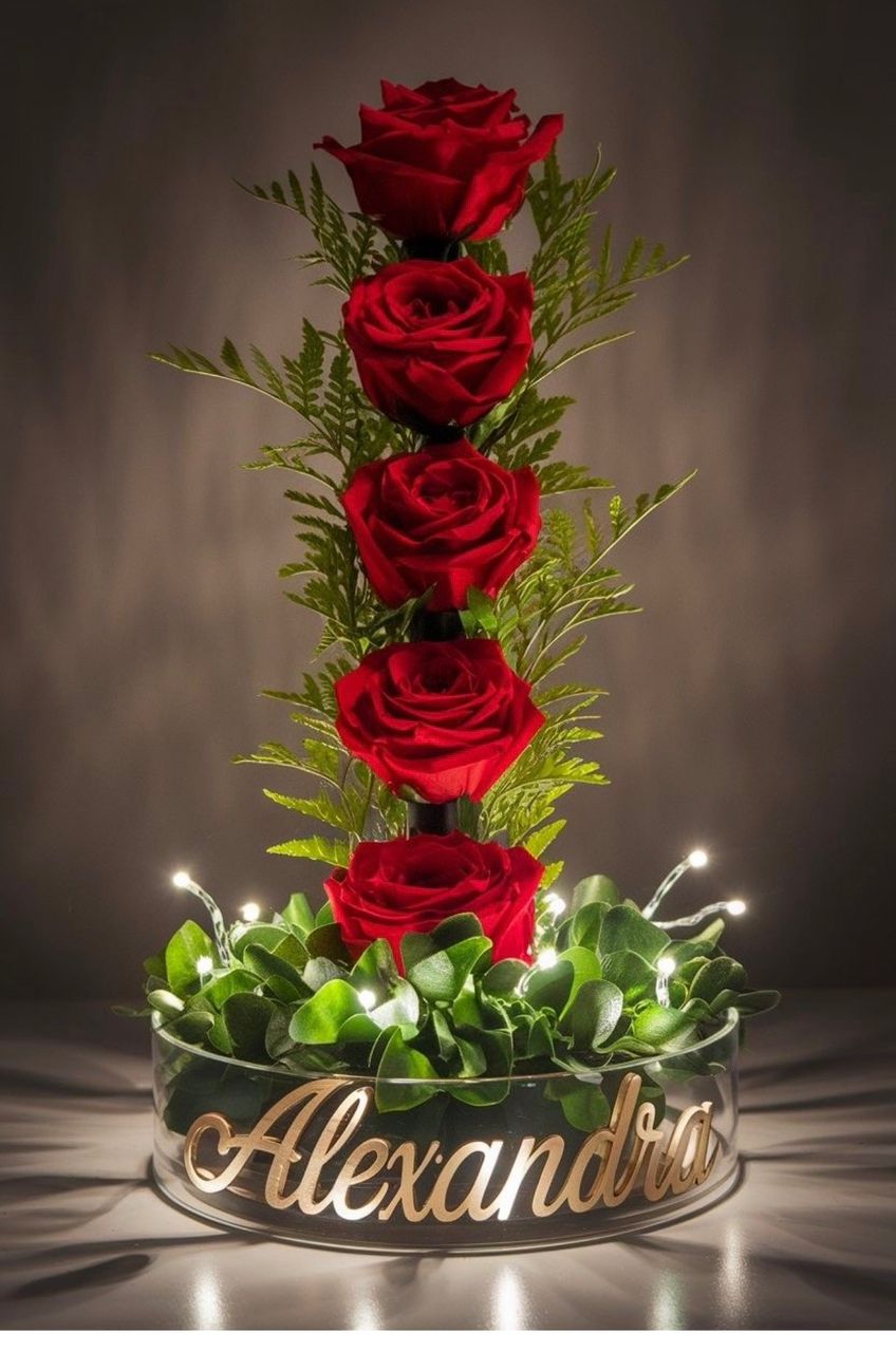 Set within a sleek glass vessel, the base is filled with vibrant foliage and woven with delicate LED fairy lights, creating an enchanting glow that highlights the centerpiece’s intricate details. The defining feature is the customized gold-mirror script, which can be tailored to any name of your choice, turning a beautiful gift into a priceless keepsake.